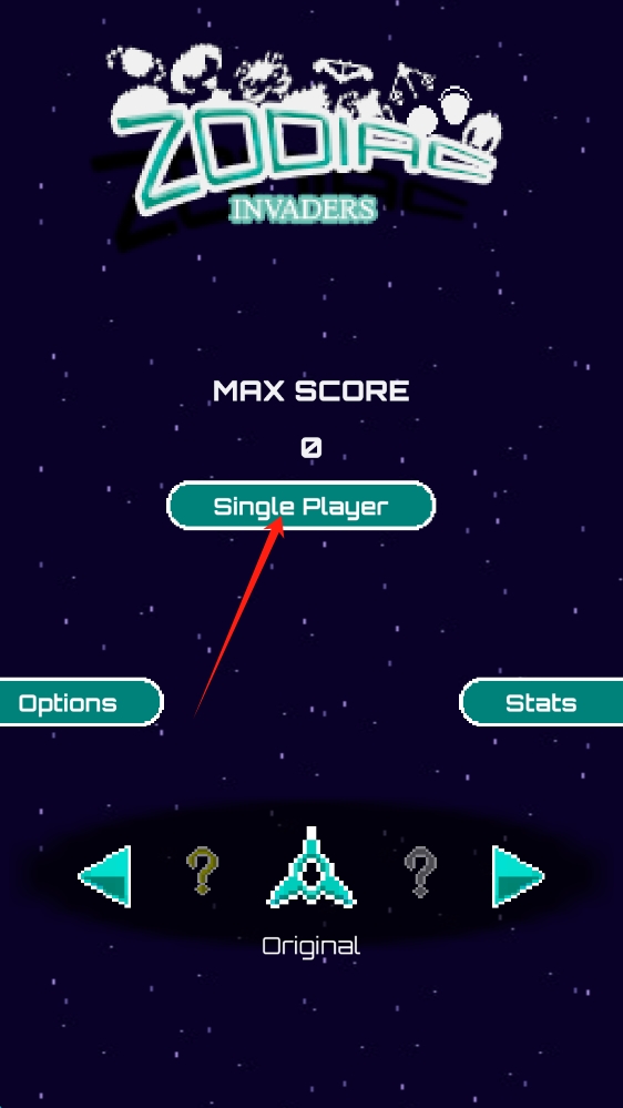 1、在Zodiac-Invaders游戏启动界面,跟随箭头提示,点击SinglePlayer,点击开始游戏。