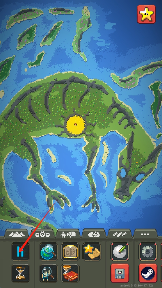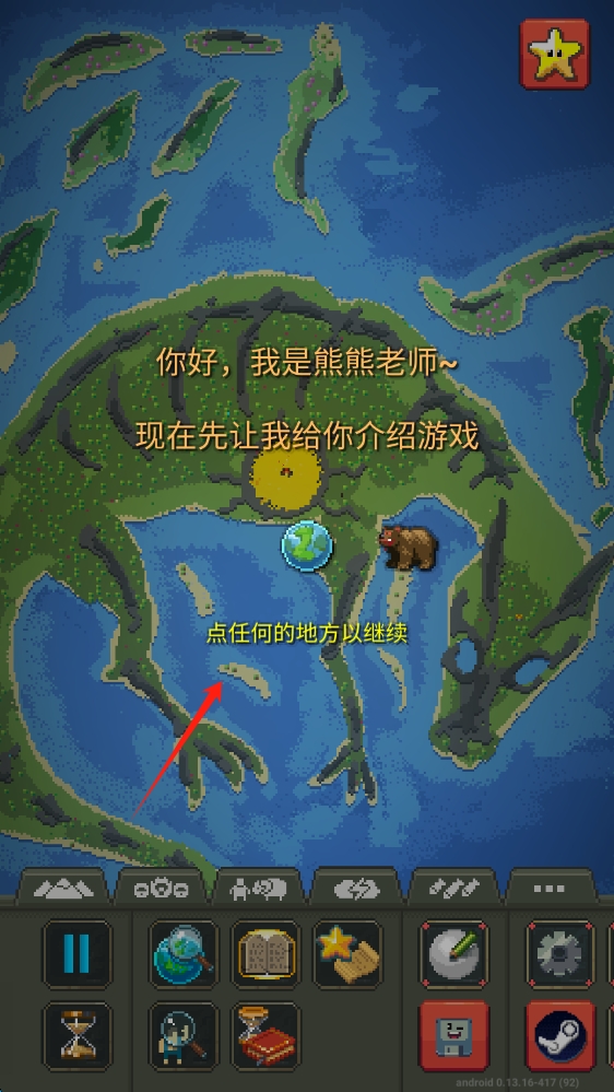 3、在游戏操作场景中,根据箭头提示,利用各种功能按钮,管理游戏世界,点击继续。