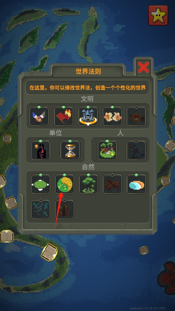2、进入世界法则设置界面,根据箭头提示,选择合适的法则,创造个性化的游戏世界。