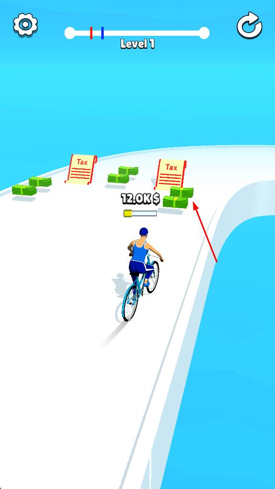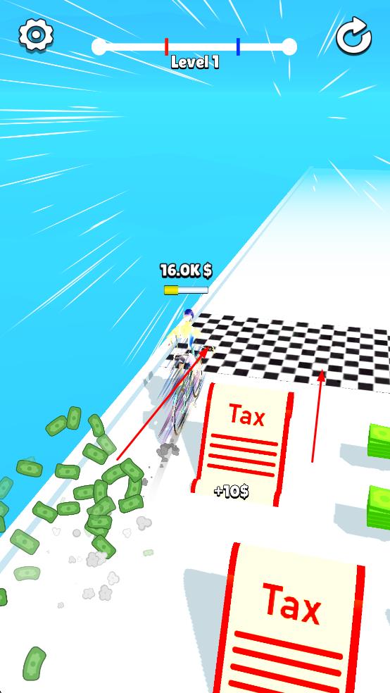 3、随着关卡推进,角色会骑上自行车,继续收集钞票道具,同时会遇到标有Tax的障碍物,注意避开这些障碍物。