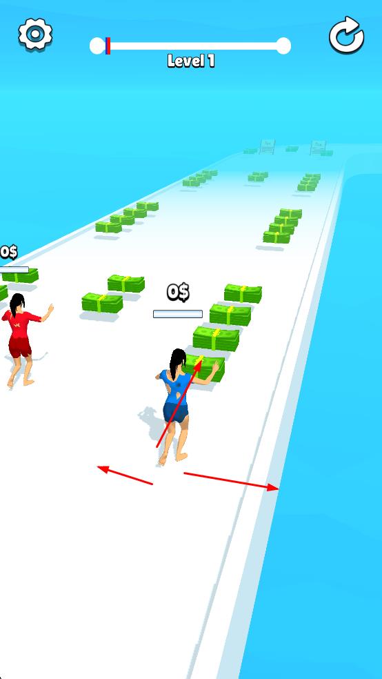 2、角色可以收集绿色的钞票道具,同时注意上方的进度条和右上角的重置按钮,为完成关卡任务奠定基础。