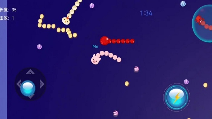 1、数据展示直观清晰,实时显示当前蛇身长度和存活时间,击杀敌人时会有醒目提示,各项成长指标一目了然,方便玩家调整策略。