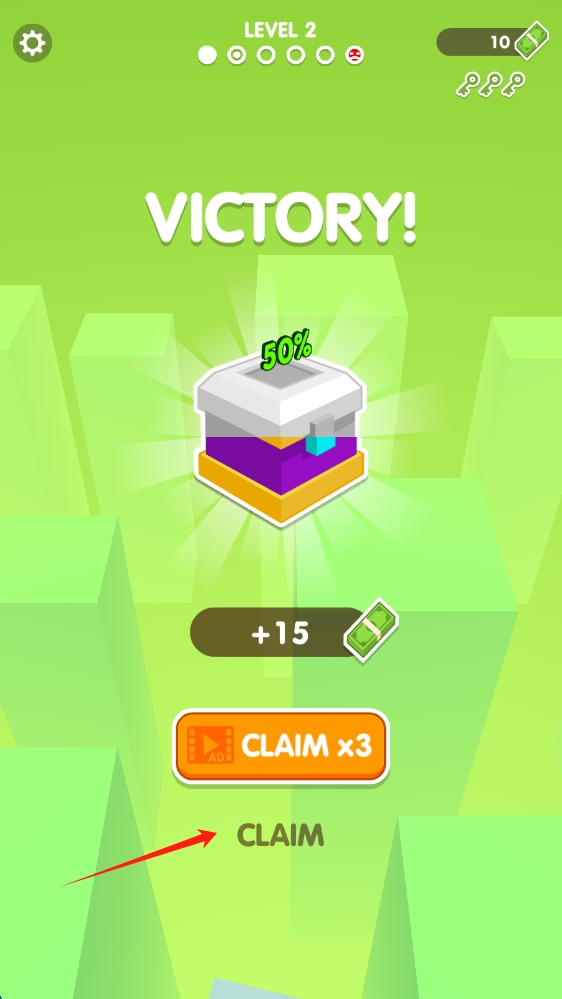 3、在游戏胜利界面,根据箭头提示,点击CLAIM,领取奖励,继续挑战下一关,探索更多游戏内容,推进游戏进度。