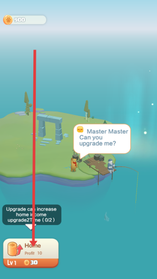 1、进入岛屿场景,关注角色的互动的提示,当角色要升级场景的物资时,根据提示进行操作。
