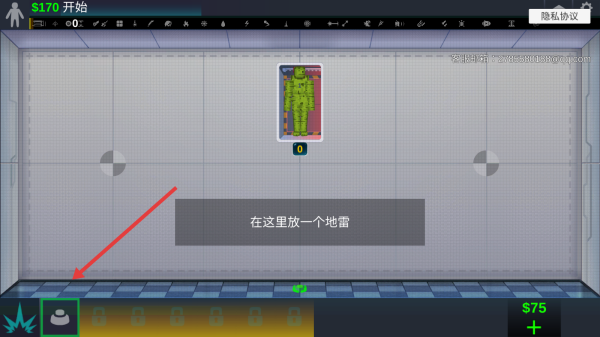 1、进入关卡后,依据在这里放一个地雷的提示,点击左下角地雷图标,将地雷放置至指定区域完成布置。