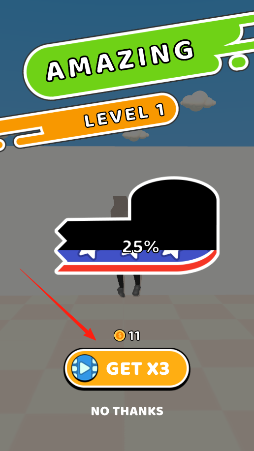 2、完成第一关后,界面显示奖励选项,点击GETX3,观看广告可获得三倍金币,或选NO THANKS直接领取基础金币,通过选择获取奖励用于后续关卡,体验奖励结算玩法。