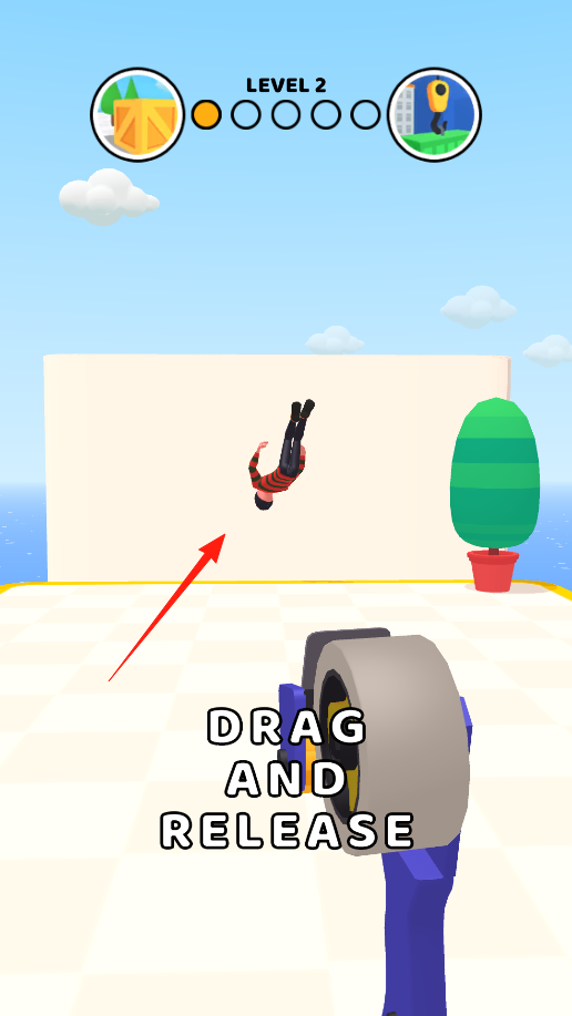 3、进入第二关,拖动人物并释放,使其利用弹射装置飞行,调整拖动参数,让人物越过障碍抵达目标区域,体验关卡难度提升与弹射进阶玩法。
