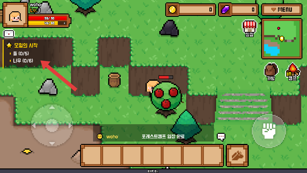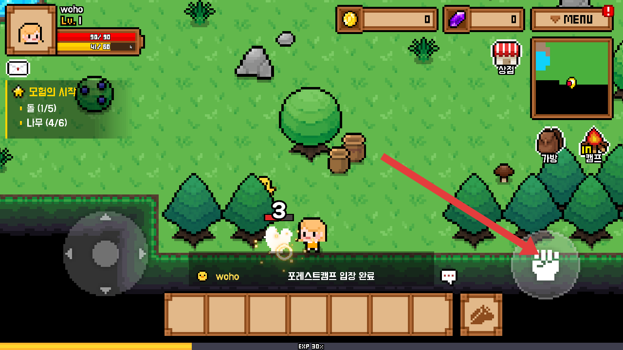 3、遇敌人或者采集物时,可以点击右侧的拳头图标,进行攻击或采集,完成任务的目标。