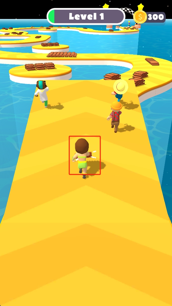 1、开局我们于黄色跑道场景中,操控角色沿跑道奔跑,注意躲避其他人物,规划路径向终点前进。