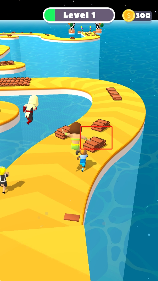 2、奔跑途中会遇到红框标注的砖块堆,我们需要控制角色靠近并拾取,收集建筑材料助力通关。