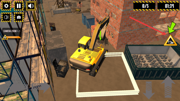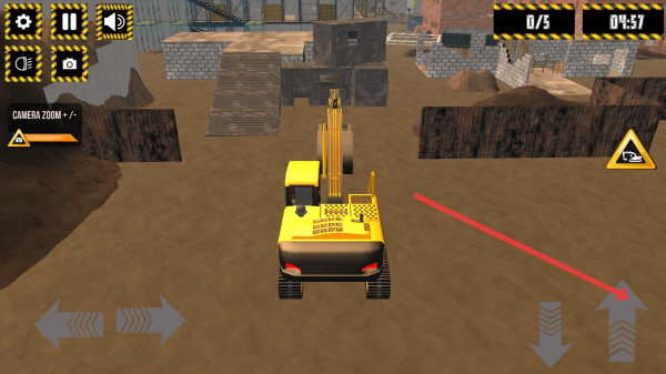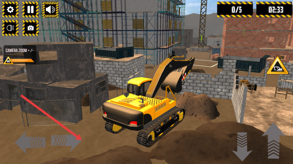 2、依据工地建筑、土堆布局,灵活驾驶挖掘机,利用操作按钮调整方向,前往目标区域,注意避开障碍物。