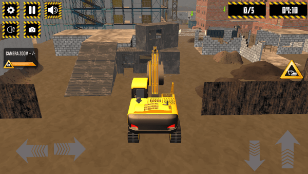 1、进入游戏,操控挖掘机在工地场景移动,留意上方0/5任务量与04:37时间,熟悉左右转向、前后行进操作。