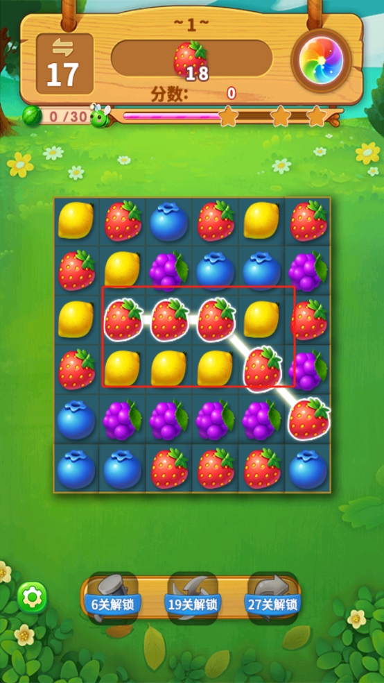 2、进入消除界面,观察红框内草莓与柠檬分布,通过交换相邻水果位置,使至少三个相同水果连成一线,触发消除得分。