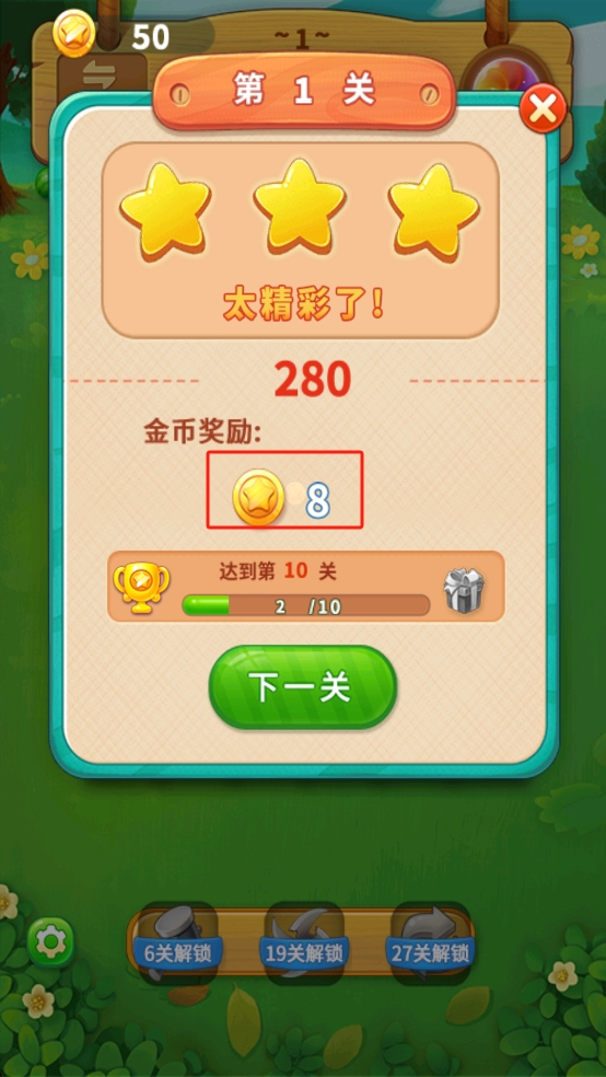 3、成功通关后,界面显示获得8金币奖励,然后点击绿色的下一关按钮,进入第二关继续消除挑战。