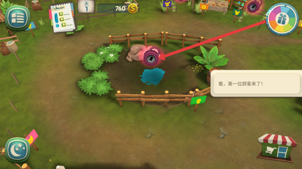 1、开启动物旅馆界面,看到第一位顾客来了的提示,查看初始的区域,完成基础引导,这是开启经营的第一步。
