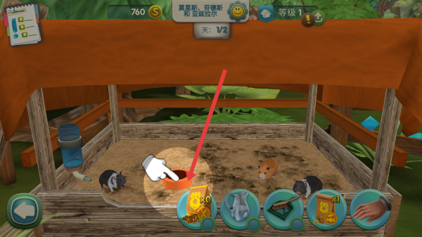 3、进入动物饲养区如豚鼠棚,按照提示用食物、水、清洁物品照顾动物,提升动物状态,一起满足经营要求。