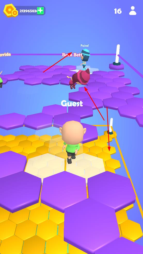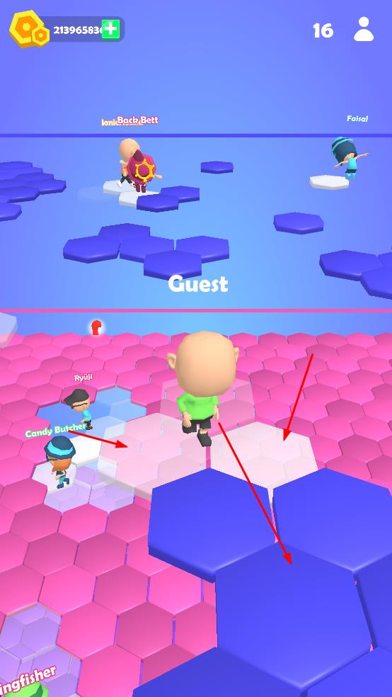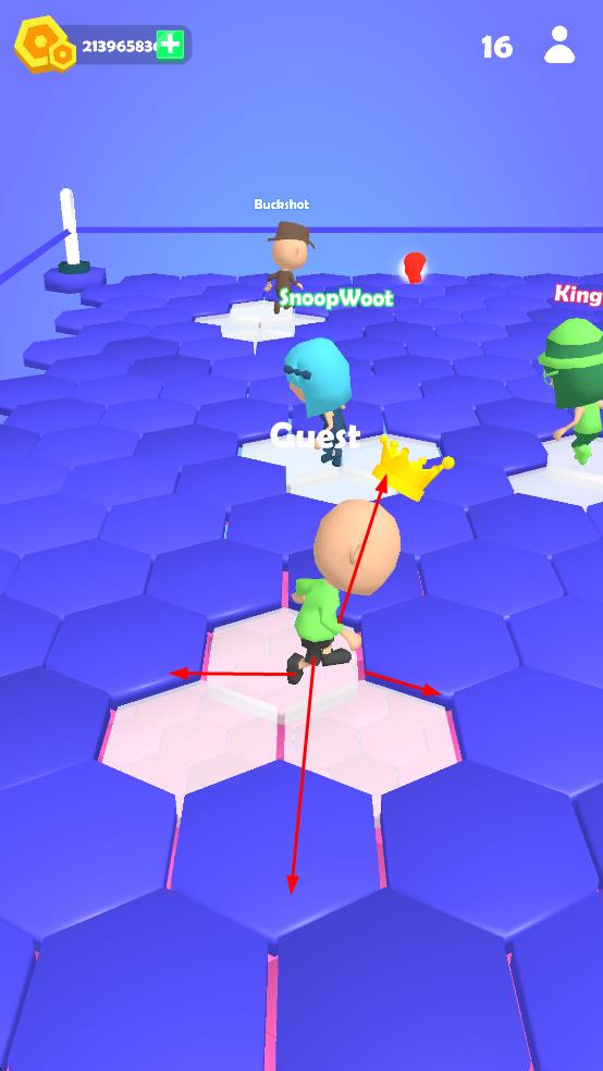 3、继续操控角色在不同颜色的六边形平台上移动,避开危险区域,与其他玩家竞争。