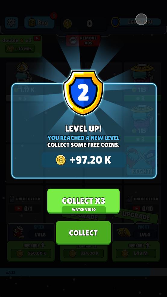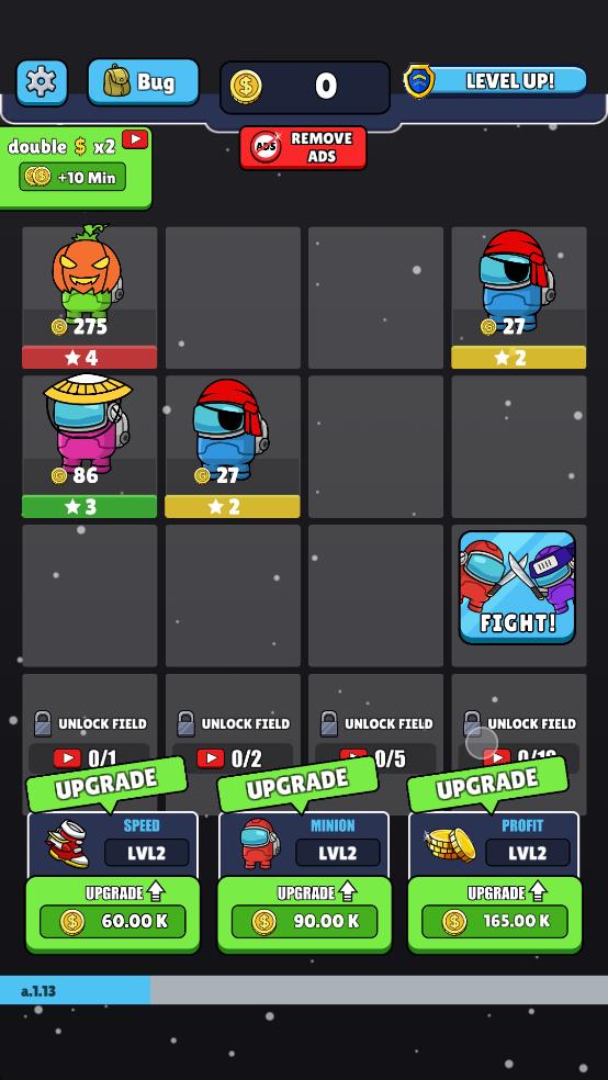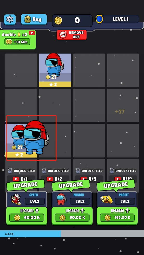 2、合并后得到等级2的蓝色宇航员,关注界面下方速度、随从、收益三类升级选项,依据游戏策略,消耗金币升级对应属性。