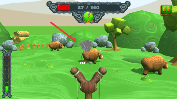 2、瞄准发射操作:弹弓由弹力橡胶带构成,射出前瞄准目标后放开手指,倾斜手机可改变轨迹,让石头射得更高更远,精准命中。