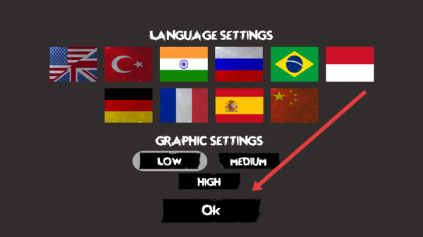 1、在语言与图形设置界面,选好语言和图形质量点击如HIGH后,点击Ok按钮确认,进入游戏主菜单。