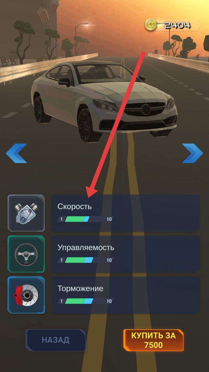 1、进入汽车改装的界面,可以使用金币来进行升级Скорость速度属性,提升车辆行驶的速度。
