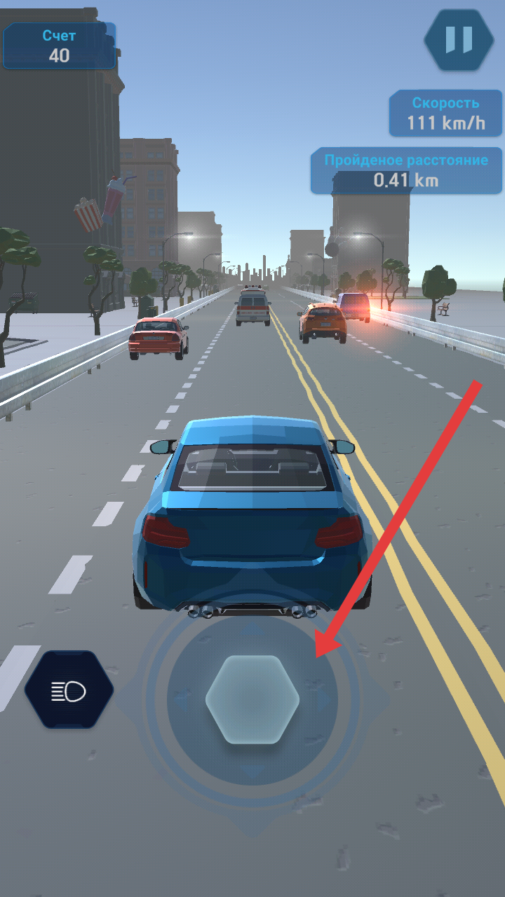 2、在驾驶过程中,使用底部六边形按钮来控制汽车左右移动、加速,灵活躲避前方的其他车辆。