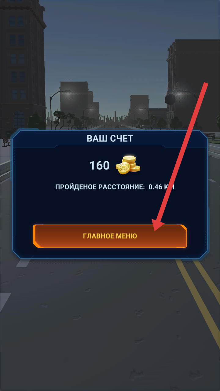 3、撞到其他车辆则游戏结束,点击下方返回主菜单的按钮,返回游戏主界面,结算奖励或重启挑战。