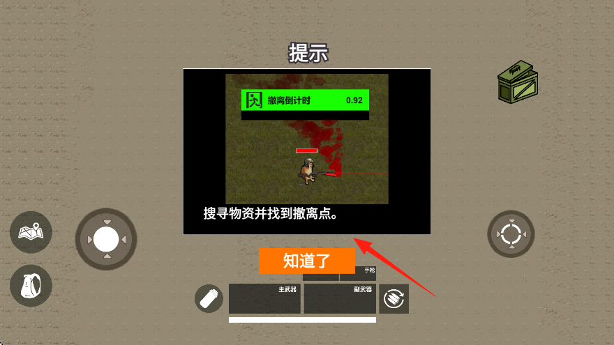 1、开局点击知道了,确认搜寻物资并找撤离点任务,注意倒计时0.92,准备行动。