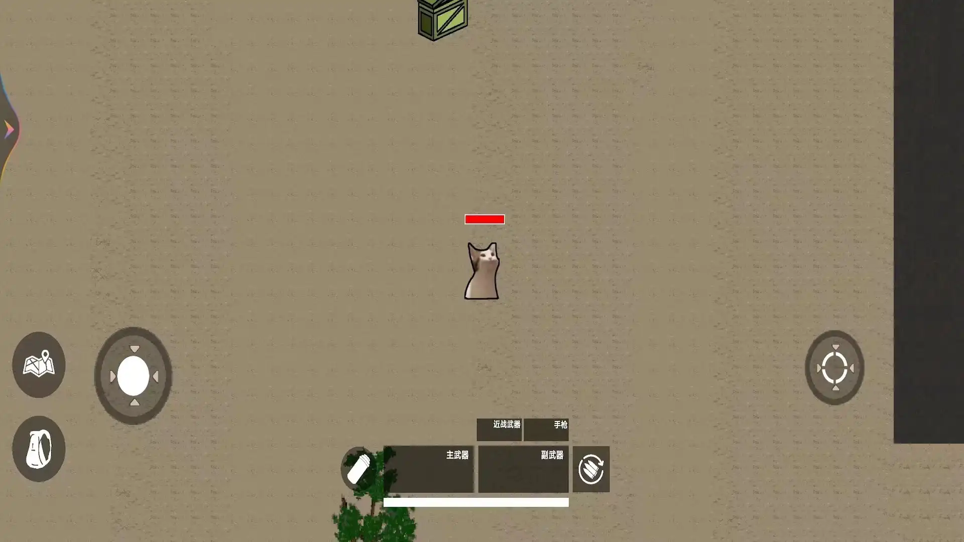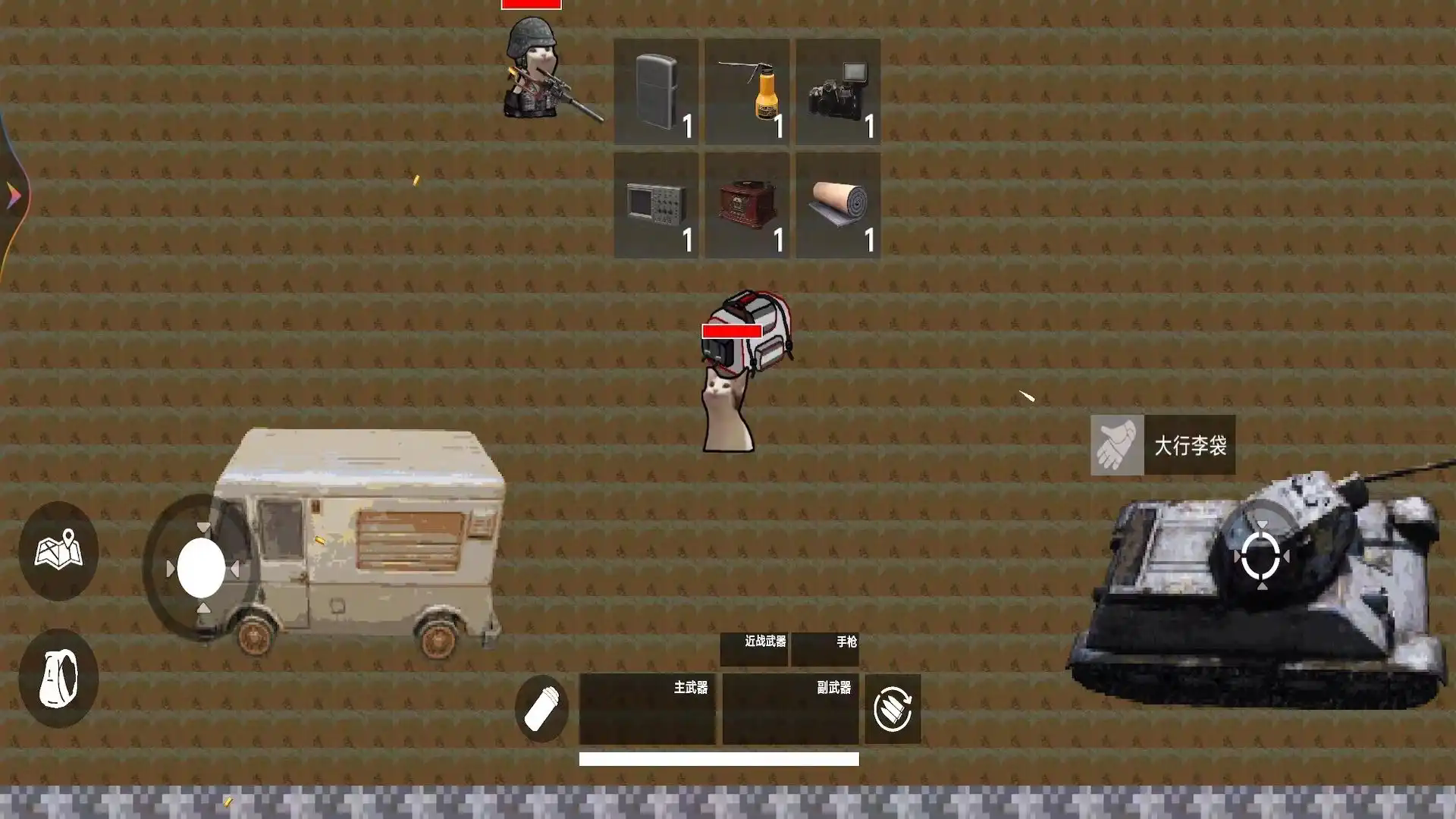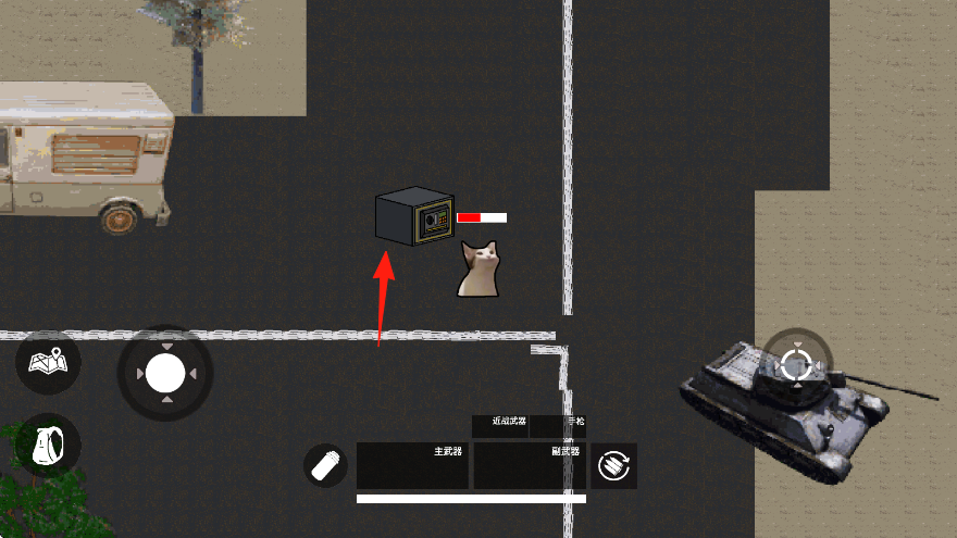 2、按箭头找黑箱子,靠近互动,获取物资武器、道具,遇到猫和载具坦克、房车,可探索或避开。