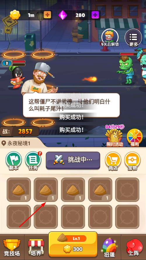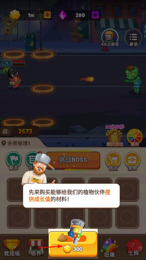 3、在战斗场景中,僵尸会向植物进攻,点击上阵按钮,将已拥有的植物放置在合适位置,利用植物的攻击和防御能力抵御僵尸入侵,消灭僵尸。