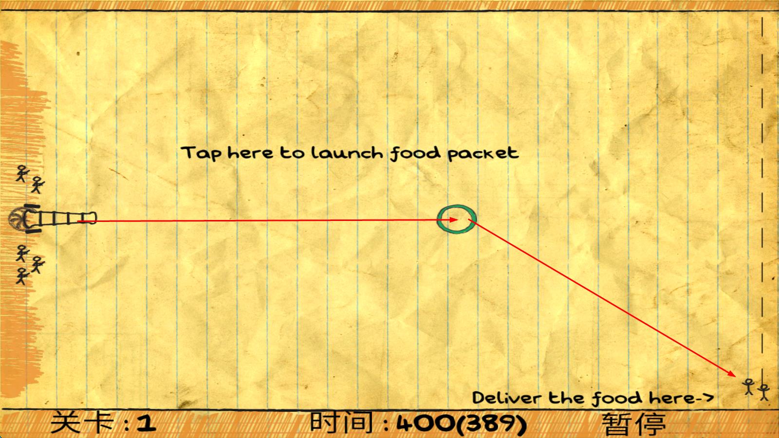 1、进入游戏首关,面对基础场景,将大炮对准中间绿色瞄准镜位置,松开手指发射,把食物投送到右下角小人处,完成首次挑战。