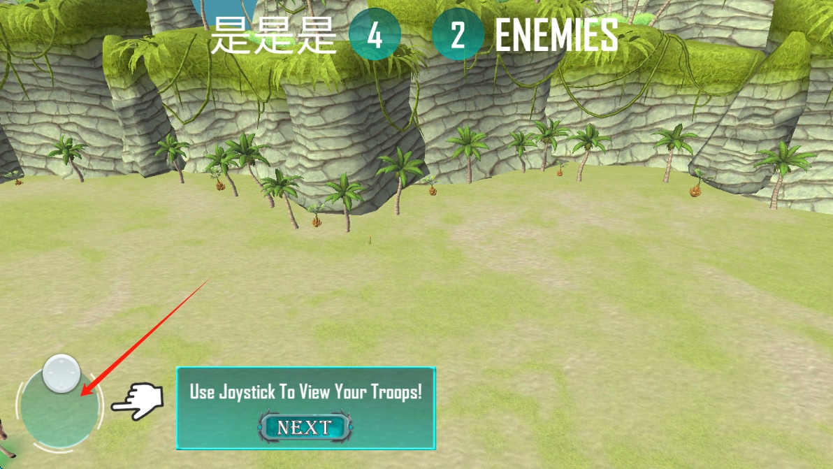 2、教学界面按提示,滑动操纵杆,熟悉部队查看操作,掌握基础游戏控制,拨动轮盘移动视角。