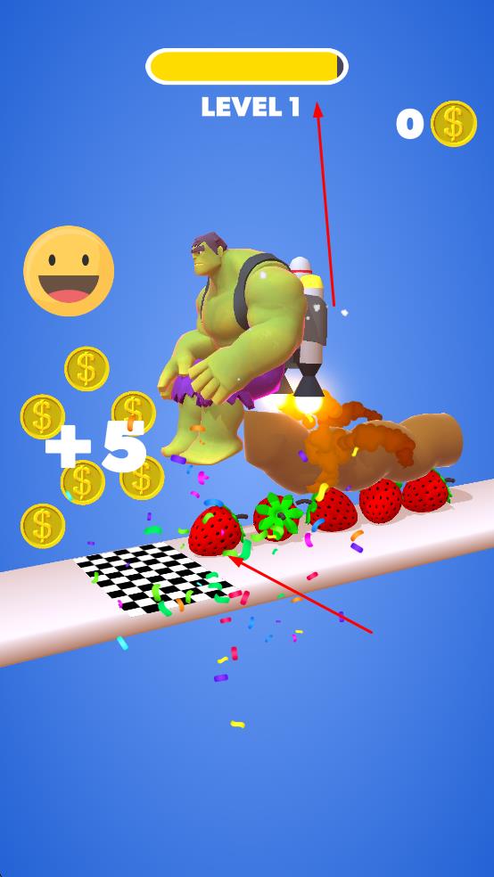 2、角色需要收集金币,同时注意路径上的草莓、辣椒等道具,为完成关卡任务奠定基础。