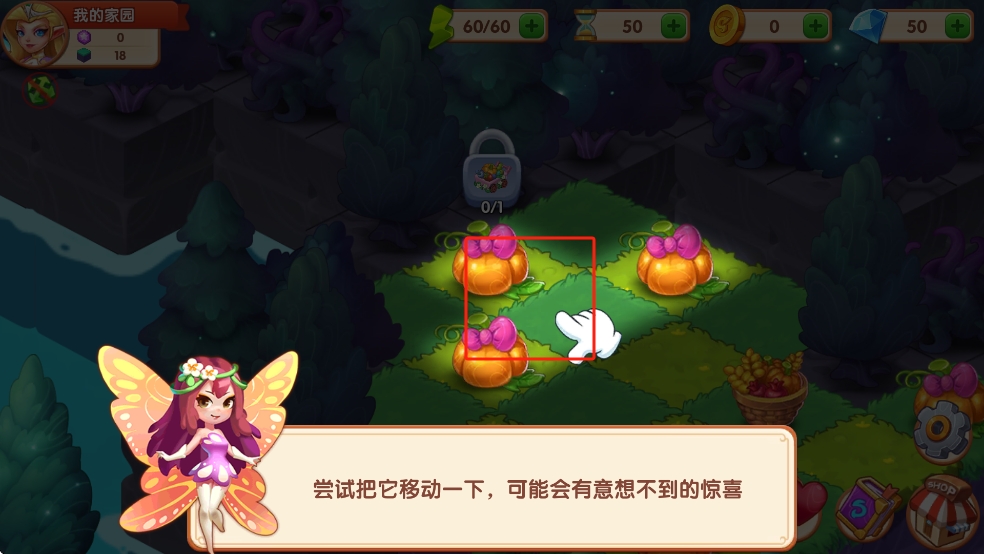 1、在我的家园场景,依据提示拖动带粉蝴蝶结的南瓜,通过移动触发隐藏惊喜,比如解锁新区域、获得资源,操作时留意手势指引的南瓜位置。