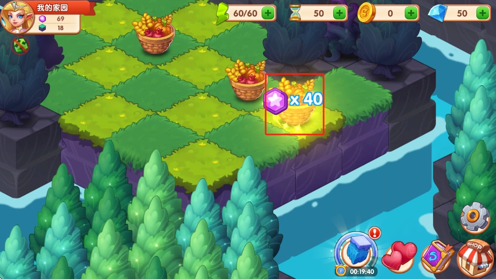 2、移动南瓜后,场景切换至新区域,出现带×40标识的奖励篮,需前往该区域收取,可获得星钻等资源,用于后续养成或建造。