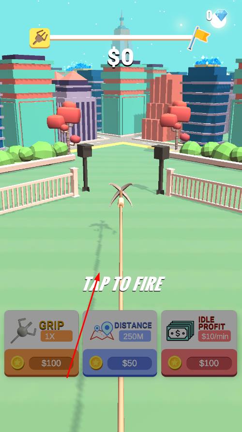 1、进入游戏,在初始界面中,可看到钩子,点击TAP TO FIRE,发射钩子。