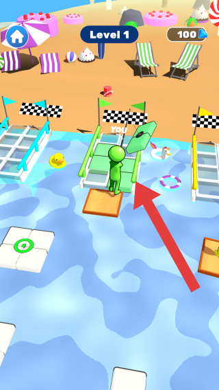 2、画面显示游戏处于第1关,玩家操控绿色角色区拾取散落在各处的砖块,拾取后再返回自己所在的区进行铺路。