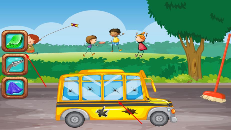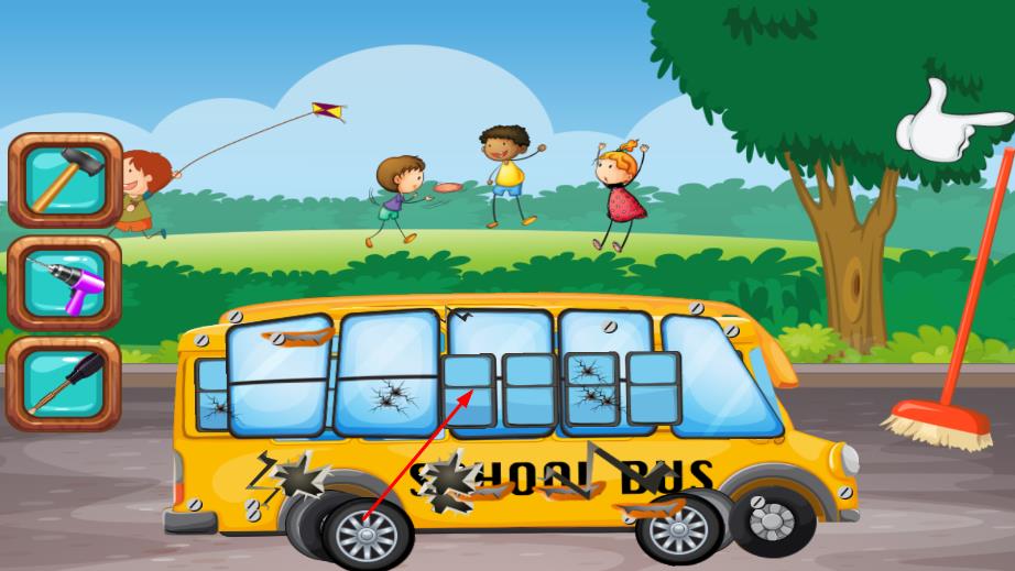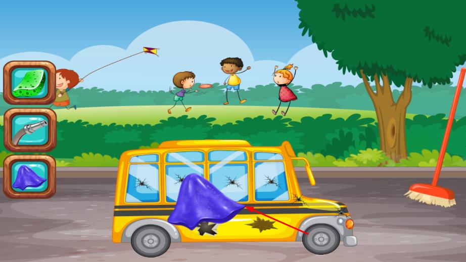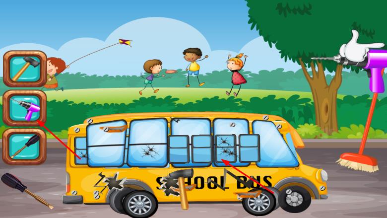 2、看到待修理的校车,车身可能有破损、污渍等问题,左侧会显示各种修理工具,根据校车的损坏情况,点击相应的工具,对校车进行清洁、修复等操作。