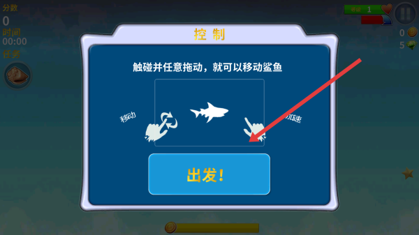 2、在阅读完控制指引触碰拖动移动鲨鱼后,按照指示通过点击出发按钮,随即进入游戏主场景。