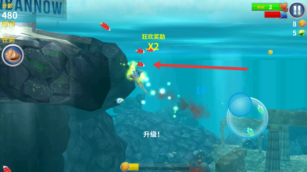 3、在场景中,滑动屏幕操控鲨鱼移动,捕食小鱼等目标,获取分数、升级,推进游戏进程。