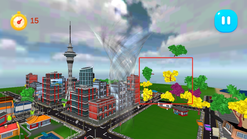 2、倒计时剩15秒时,龙卷风卷着树木,快速操作摇杆,让龙卷风靠近城市的设施,引导被卷物体砸向建筑。