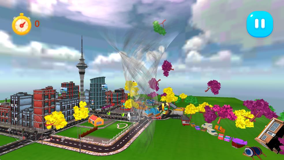 1、开局有倒计时,左侧摇杆控制视角或移动,关注龙卷风,规划路线,卷走树木,破坏城市的建筑。