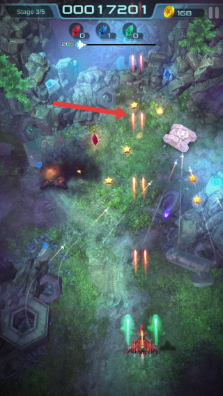 1、操控自己的战机穿梭场景,收集星星与各色水晶,同时躲避敌方发射的炮火,提升关卡得分与资源获取。