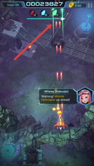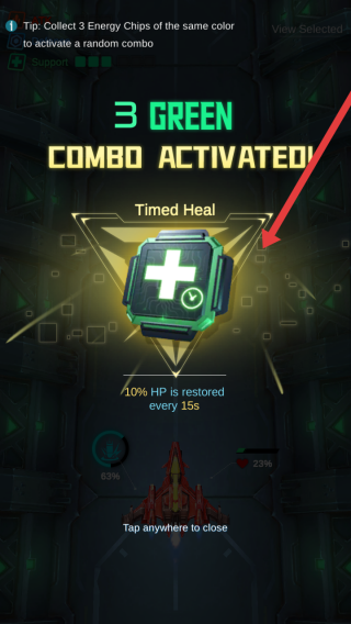 3、收集3个绿色能量芯片,激活3GREEN COMBO,获得每15秒恢复10%HP的效果,提升战机生存能力。