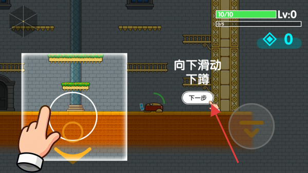2、向下滑动屏幕,使角色下蹲,点击下一步按钮,继续进行游戏任务。