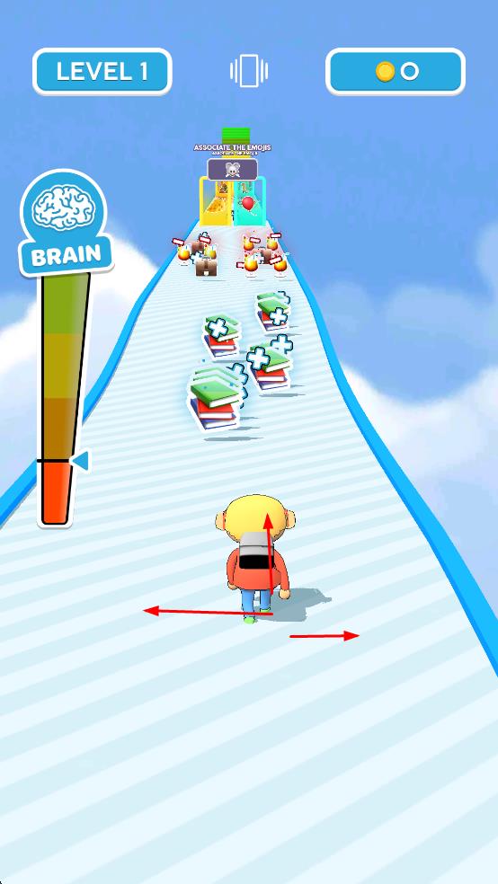 1、在LEVEL1等关卡中,操控角色在赛道上移动,可左右移动收集赛道上的书本等物品,提升BRAIN值。