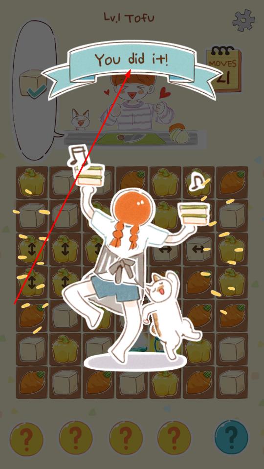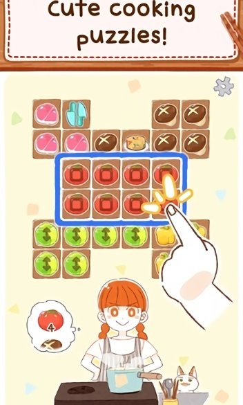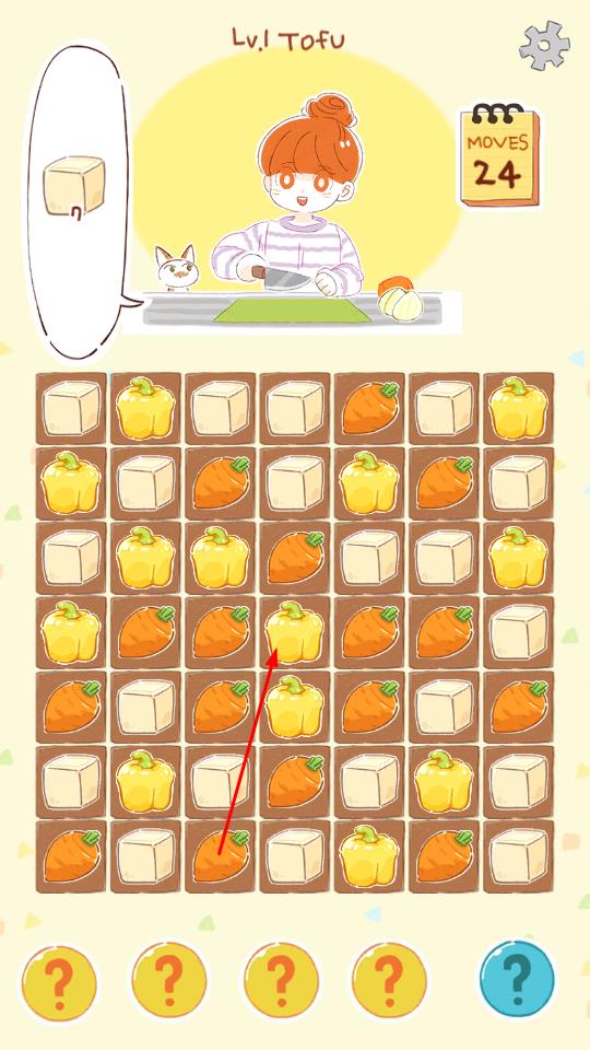 1、主题页展现温馨场景,点击开始进入关卡,如Lv.1Tofu豆腐关卡,依据食材布局,规划消除路径。