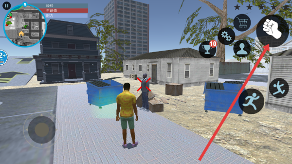 2、遇到带红叉敌人,点击拳头图标近战攻击,查看周围环境或捡场景武器如路边物品远程打击。