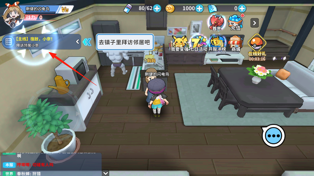 1、开局在主角房间,点击左侧主线宿敌,小奈!拜访邻居小奈任务,按指引离开家,前往镇子。