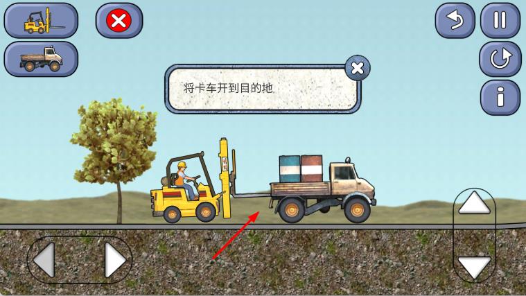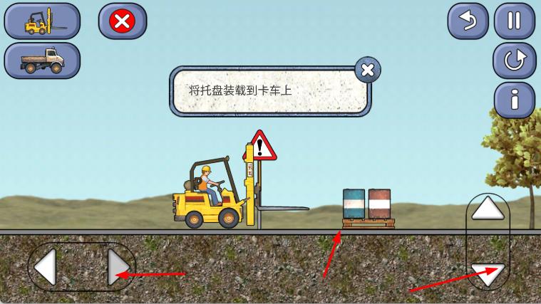2、通过屏幕左下角的方向按钮控制工程车移动,屏幕右侧的上下箭头按钮控制工程车的操作,将工程车移动到货物旁边,操作工程车将货物装载到卡车上。